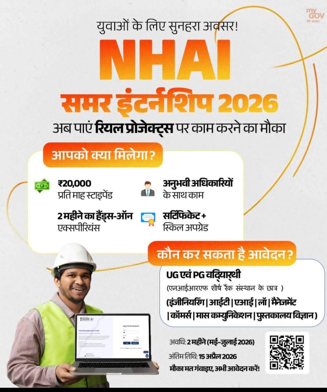 The internship is open to UG, PG, and research students in fields such as engineering, management, law, and finance, providing hands-on experience in national highway and infrastructure projects across India.
