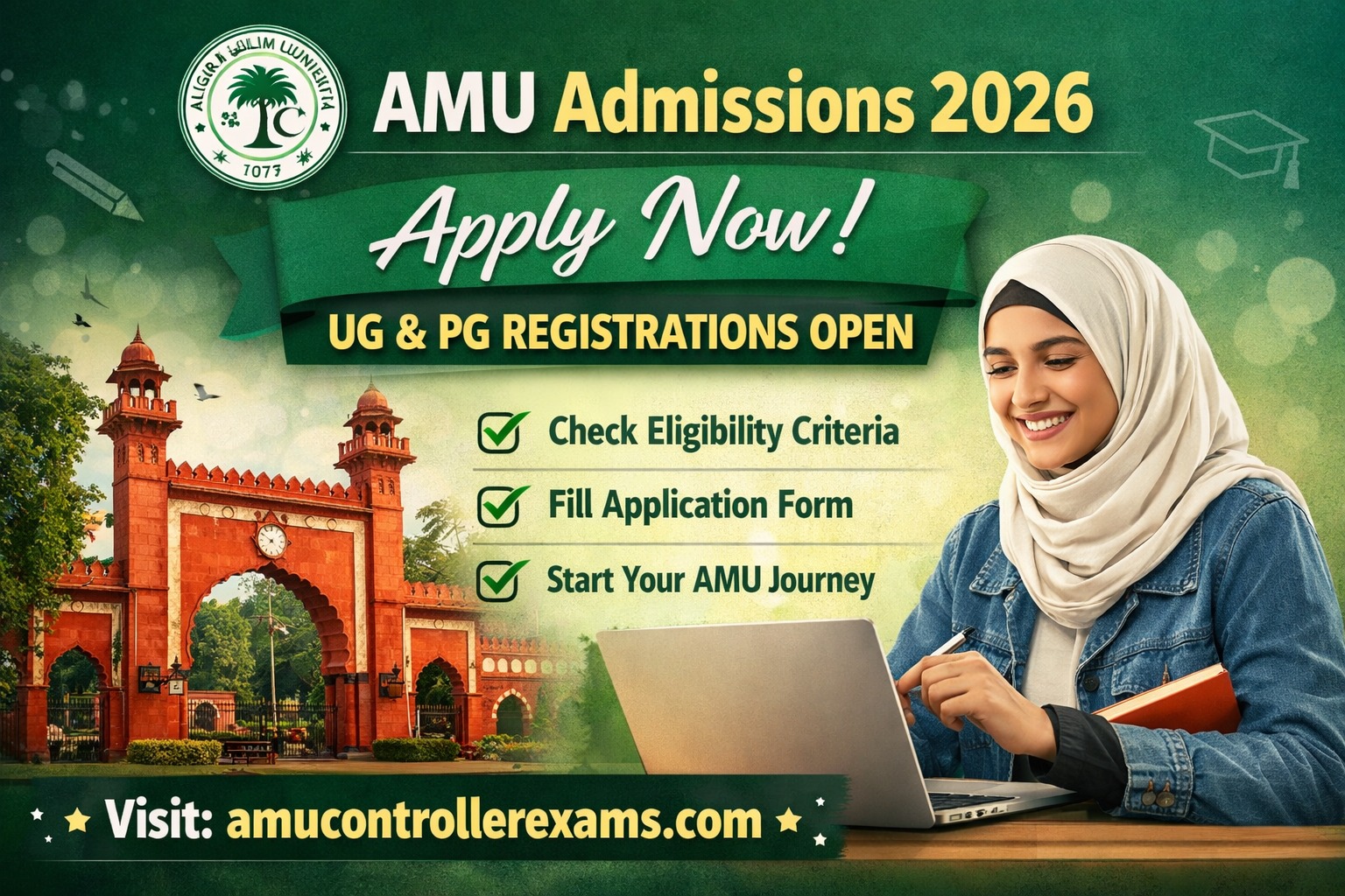 Campus Times|LucknowAMU Admissions 2026, Registration for undergraduate, postgraduate, diploma, and professional programmes at Aligarh Muslim University (AMU) begins today, February 1. Eligible candidates can submit their applications online through the official portal, amucontrollerexams.com.For the 2026–27 academic session, the application fee for AMU entrance examinations ranges from ₹750 to ₹1,050, depending on the course selected. According to university authorities, several entrance tests will be conducted in the traditional pen-and-paper mode.As per the official schedule, AMU will hold the BA (Hons) entrance examinations on April 12 and April 19, offering aspirants a key opportunity to secure admission to one of India’s premier central universities.AMU Admission 2026: Steps to registerStep 1: Visit the official website — amucontrollerexams.comStep 2: Select the admission tab given on the home page and click on the registration link.Step 3: Log in by entering your email and password.Step 4: Fill out the application form and submit the important documents.Step 5: Pay the required fee.Step 6: Download the application form and payment receipt for future reference. Candidates are required to fill out only one application form for multiple courses.AMU Exam ScheduleAMU has announced the schedule for its entrance examinations for the academic year 2026-27. The entrance exam for BTech, BArch, and BBA programmes will be held on April 19. Exams for senior secondary courses (science, humanities, commerce), engineering diploma, and the bridge course are scheduled for April 26.Entrance tests for MBA programmes, along with MPH, MSW, and BEd, will take place on June 7. A large number of candidates are expected to appear across all courses.