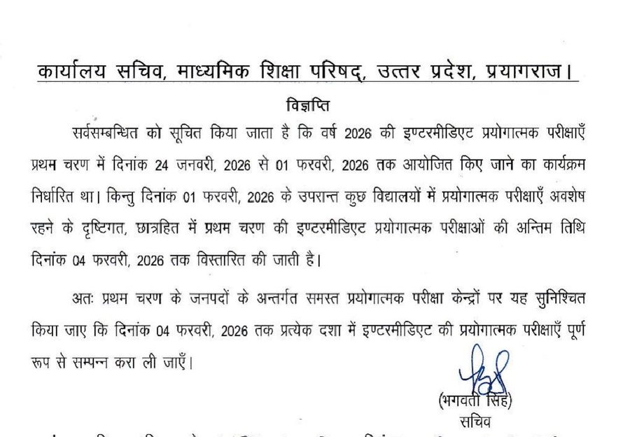 The Uttar Pradesh Madhyamik Shiksha Parishad (UPMSP) has given major relief to Intermediate students. According to an official notice issued by Board Secretary Bhagwati Singh, the last date for the first phase of practical examinations has been extended.