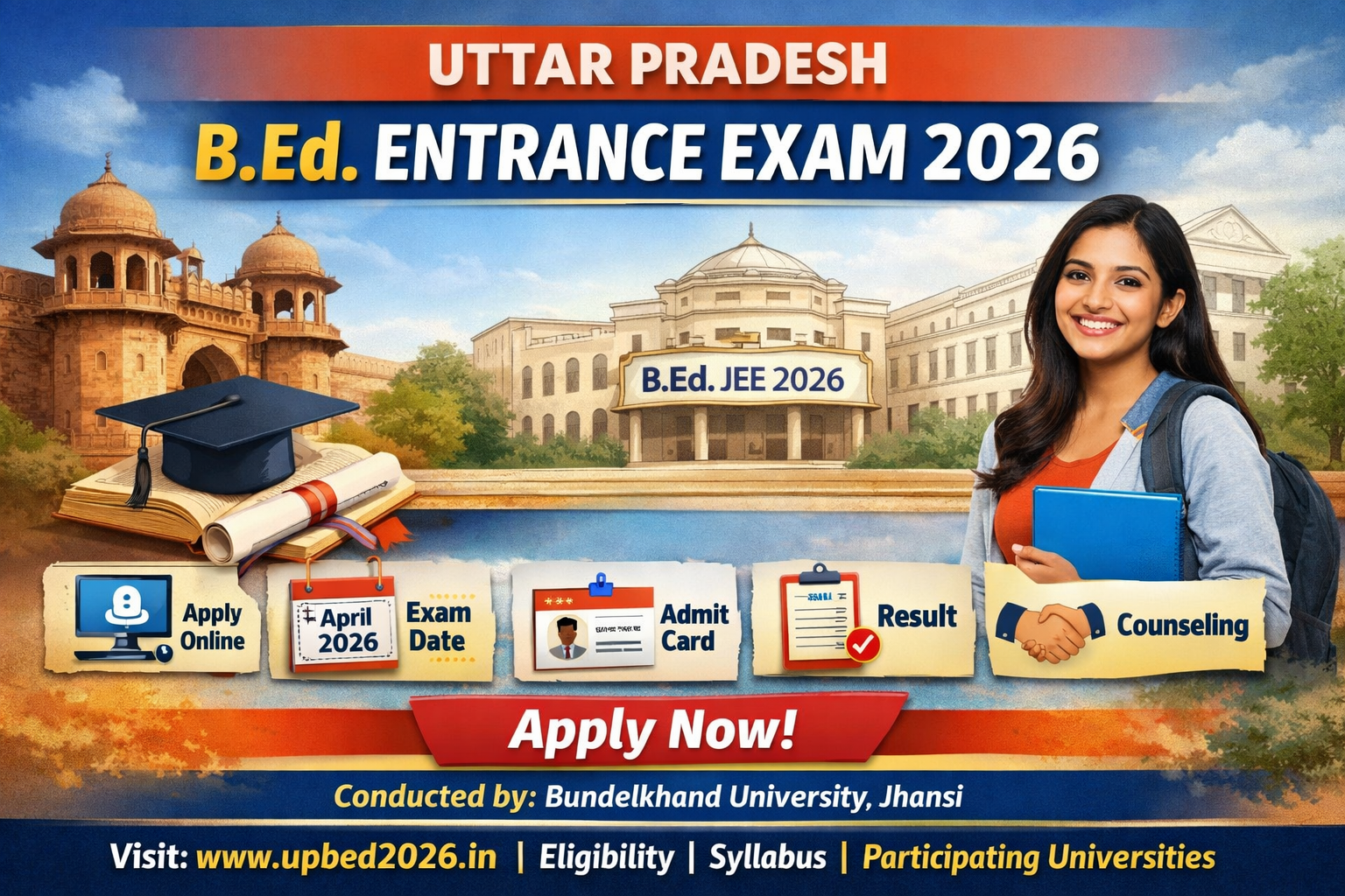 Campus Times| Lucknow Bundelkhand university got 4th time chance to conduct the UP B.Ed. JEE 2026, which is the organizing university for this academic session. Admission will be granted to B.Ed. colleges affiliated with participating universities across the state.Important DatesApplication Start Date: 10 February 2026Last Date to Apply Online: 5 March 2026UP B.Ed. JEE 2026 Exam Date: 20 to 25 April 2026Admit Card Release: Before the examinationResult Declaration: 25 to 30 May 2026Counseling Begins: June 2026Application Fee (Tentative)General / OBC / EWS: ₹1650SC / ST: ₹850(Extended fee)The examination fee can be paid through Debit Card, Credit Card, Net Banking, or offline via E-Challan at any bank branch in India.Age LimitMinimum Age: 15 YearsMaximum Age: No upper age limitCandidates are advised to refer to the official notification for detailed age-related rules …click hereCourse Details & EligibilityCourse Name: Bachelor of Education (B.Ed.)Duration: 2 YearsEducational Qualification: Bachelor’s or master’s Degree with minimum 50% marks, Engineering candidates must have at least 55% marksParticipating Universities for UP B.Ed. 2026Admissions through UP B.Ed. JEE 2026 will be conducted for colleges affiliated with the following universities:University of Lucknow (LU), LucknowMahatma Jyotiba Phule Rohilkhand University, BareillyDr. Bhim Rao Ambedkar University, AgraDr. Ram Manohar Lohia Avadh University, AyodhyaChaudhary Charan Singh University, MeerutBundelkhand University, Jhansi (Conducting University)Mahatma Gandhi Kashi Vidyapith, VaranasiSampurnanand Sanskrit University, VaranasiVeer Bahadur Singh Purvanchal University, JaunpurDeen Dayal Upadhyay Gorakhpur UniversityChhatrapati Shahu Ji Maharaj University, KanpurAllahabad State University (Rajju Bhaiya University), PrayagrajJan Nayak Chandrashekhar University, BalliaSiddharthanagar Vishwavidyalaya, KapilvastuKhwaja Moinuddin Chishti University, LucknowGautam Buddha University, NoidaMaharaja Suheldev University, AzamgarhMaa Shakumbhari University, SaharanpurRaja Mahendra Pratap Singh University, AligarhImportant suggestion Candidates are suggested that read the UP B.Ed. JEE 2026 official notification carefully for details regarding syllabus, eligibility, exam pattern, counseling process, participating colleges, and other instructions before applying online.